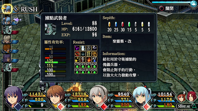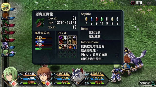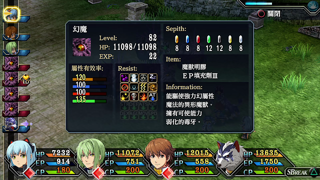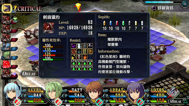 而賽特滿強的,雖然不能更改裝備,也沒有戰術導力器,但會使用各種魔法,在原野還能自動回復HP與EP,也對所有異常狀態免疫,這時候要好好的靠賽特來戰鬥。 |